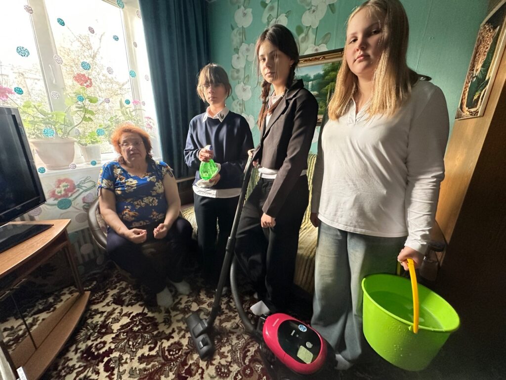 Ребята отправились помочь пенсионерке Фельдшеровой Екатерине Николаевне, ей 68 лет. Екатерина Николаевна с удовольствием познакомилась с помощниками, узнала про их интересы и увлечения, рассказала много интересного из своей жизни.