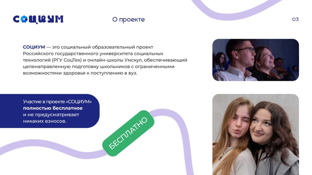 Проект «СОЦИУМ» направлен на онлайн-подготовку к внутренним вступительным испытаниям в образовательные организации высшего образования по таким предметам, как профильная математика, русский язык, информатика, обществознание, история и биология для лиц с инвалидностью. Кроме того, участие также доступно для выпускников, получивших общее среднее или среднее профессиональное образование, а также учащихся выпускных классов соответствующих образовательных организаций.